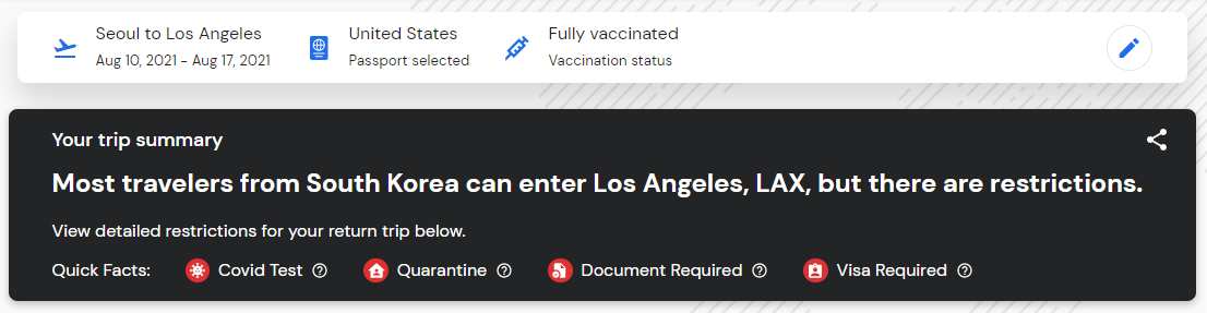 예를 들어 인천공항에서 LA공항으로 7일간 있다가 다시 인천으로 돌아오는 일정을 검색해본다. 그리고 검색어 입력 위에 보면 왕복인지 편도인지 / 경유인지 아닌지 / 백신 접종 완료인지 아닌지/ 소지여권은 어느국적인지를 반드시 체크해야 가장 정확한 결과를 알 수 있다.