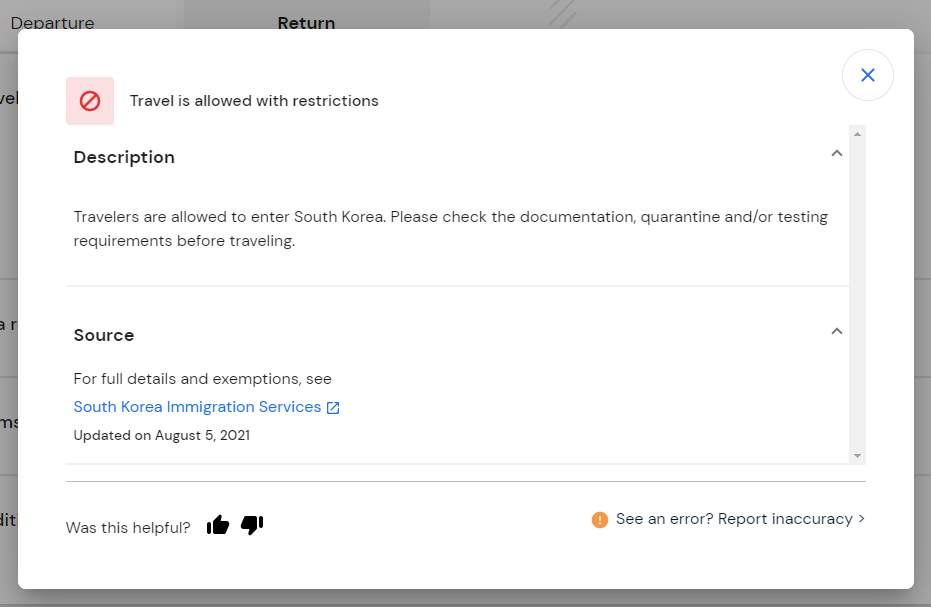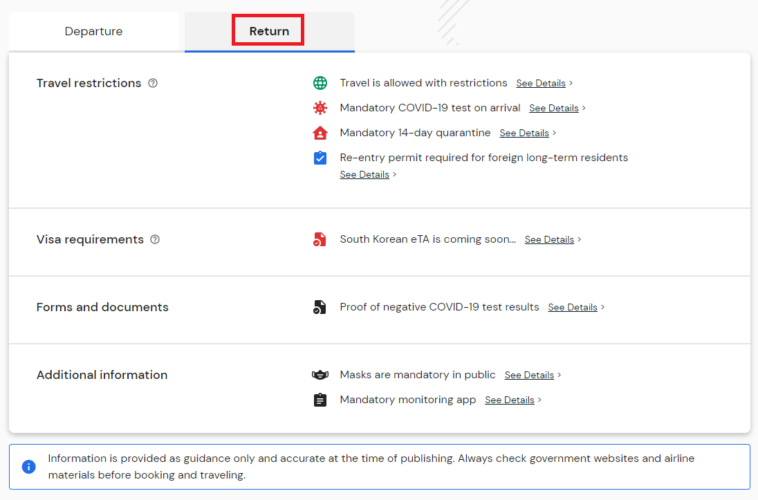구체적으로 See Details (세부정보보기)를 클릭하면 상세한 설명과 함께 이 설명이 어디서 나온 설명인지 출처까지 명시하고 있다. 한국의 경우 Korea Immigration Service (출입국·외국인정책본부)에서 나온 상세한 설명을 바탕으로 작성되었다는 것을 알 수 있다. 신뢰도가 높아지는 출처 설명이다.