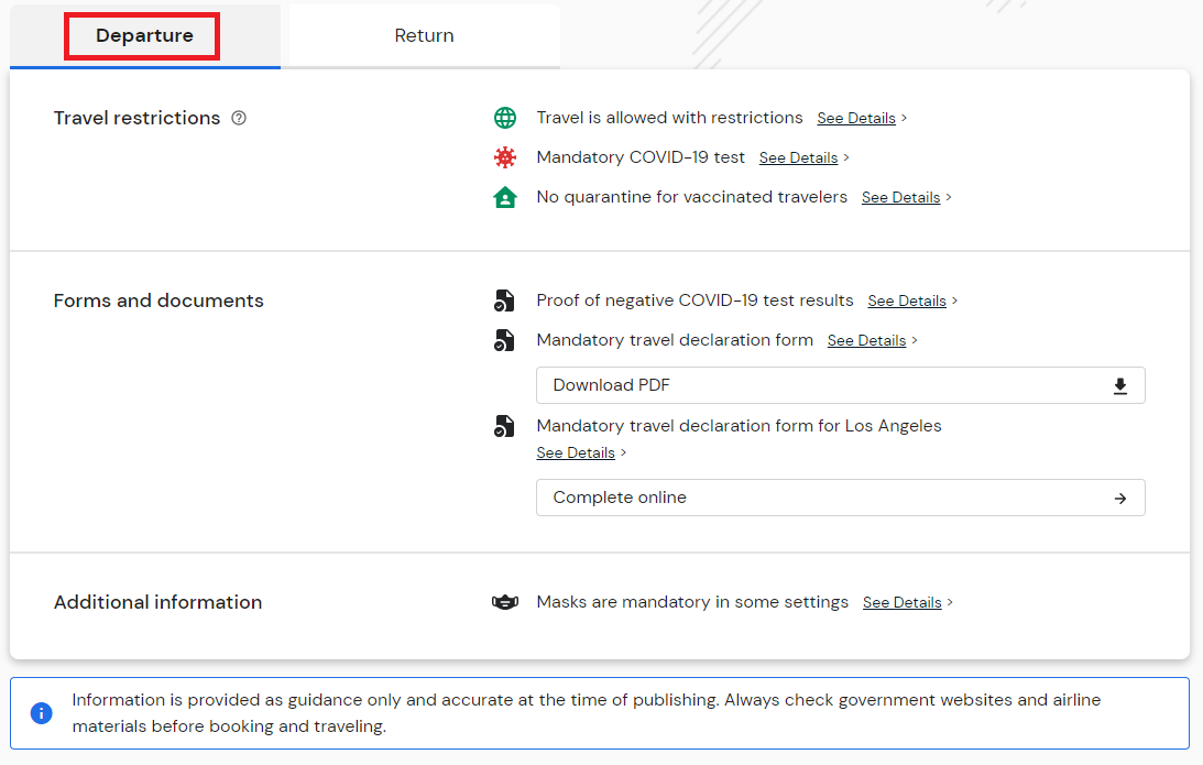검색 시 왕복으로 설정을 했기 때문에 인천공항 출발할 때, 그리고 LA공항을 떠나 인천공항으로 들어갈 때 각각의 조건을 모두 체크해서 한 눈에 알 수 있도록 표시가 되어있다. 그렇다면 이 조건은 어떤 것을 기준으로 작성된 것일까?
