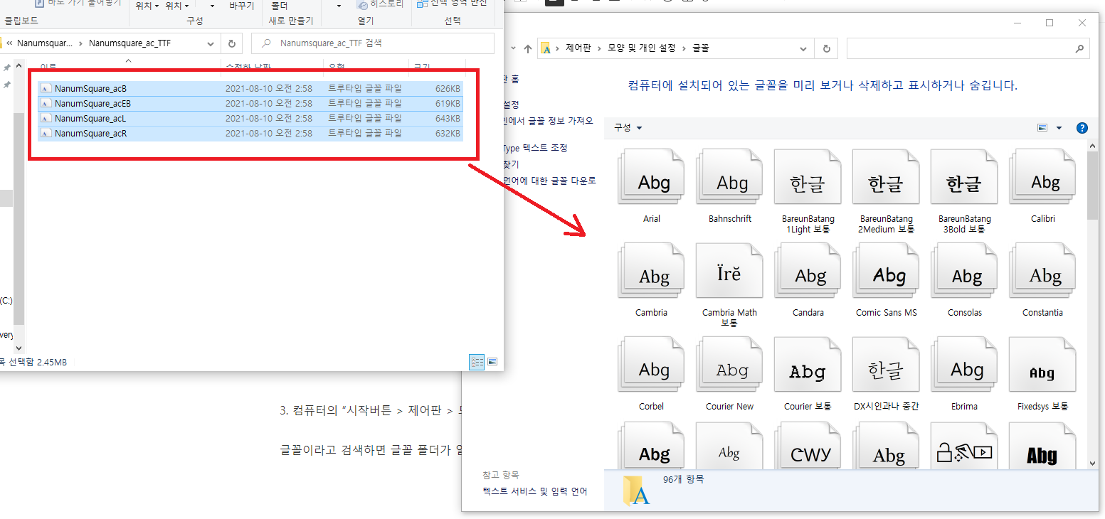 3. 컴퓨터의 “시작버튼 > 제어판 > 모양 및 개인설정 > 글꼴을 찾아간다.