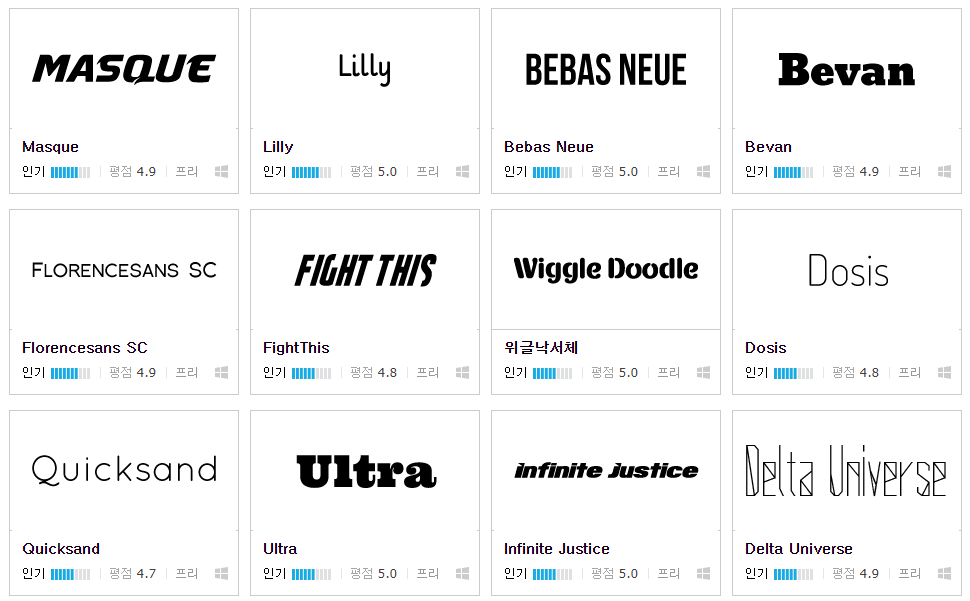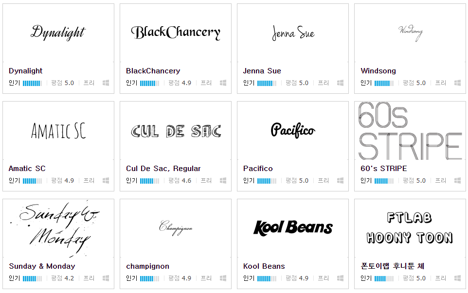 사실 등록된 무료 폰트 갯수를 모두 세어본 것은 아니지만 대략 몇백개이상은 되지 않을까 싶다. 기업이 제공하는 폰트부터 누구나 사용할 수 있는 폰트까지. 보다보면 다 마음에 들어서 폰트 무료쇼핑하게 되는 기분이랄까!