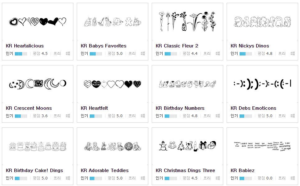 한글, 영어, 특수문자 폰트로 카테고리가 나뉘어지며 취향껏 선택 가능하다.