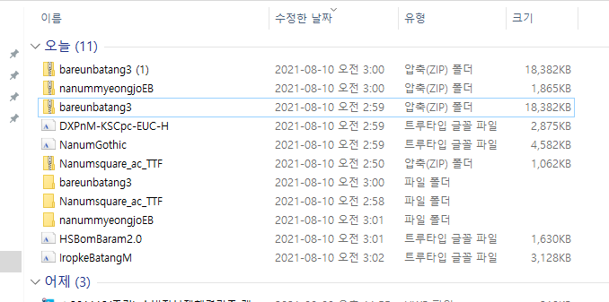 압축 ZIP 파일로 다운로드 되었거나 혹은 트루타입 글꼴 파일로 다운로드 되었거나.