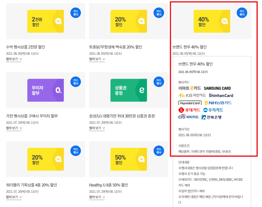 참고로 이 휴가지 바캉스 미트클럽 행사에는 "브랜드 한우"는 해당되지 않는다. 하지만 브랜드 한우는 카드사 제휴 할인으로 이벤트가 진행중에 있다. 8월 11일까지 사용가능하며 삼성카드, KB국민카드, 신한카드, 농협카드, 현대카드, 롯데카드, 우리카드, 씨티카드, 전북은행카드가 이마트 e카드로 발급이 되었다면 40% 할인이 가능하다.