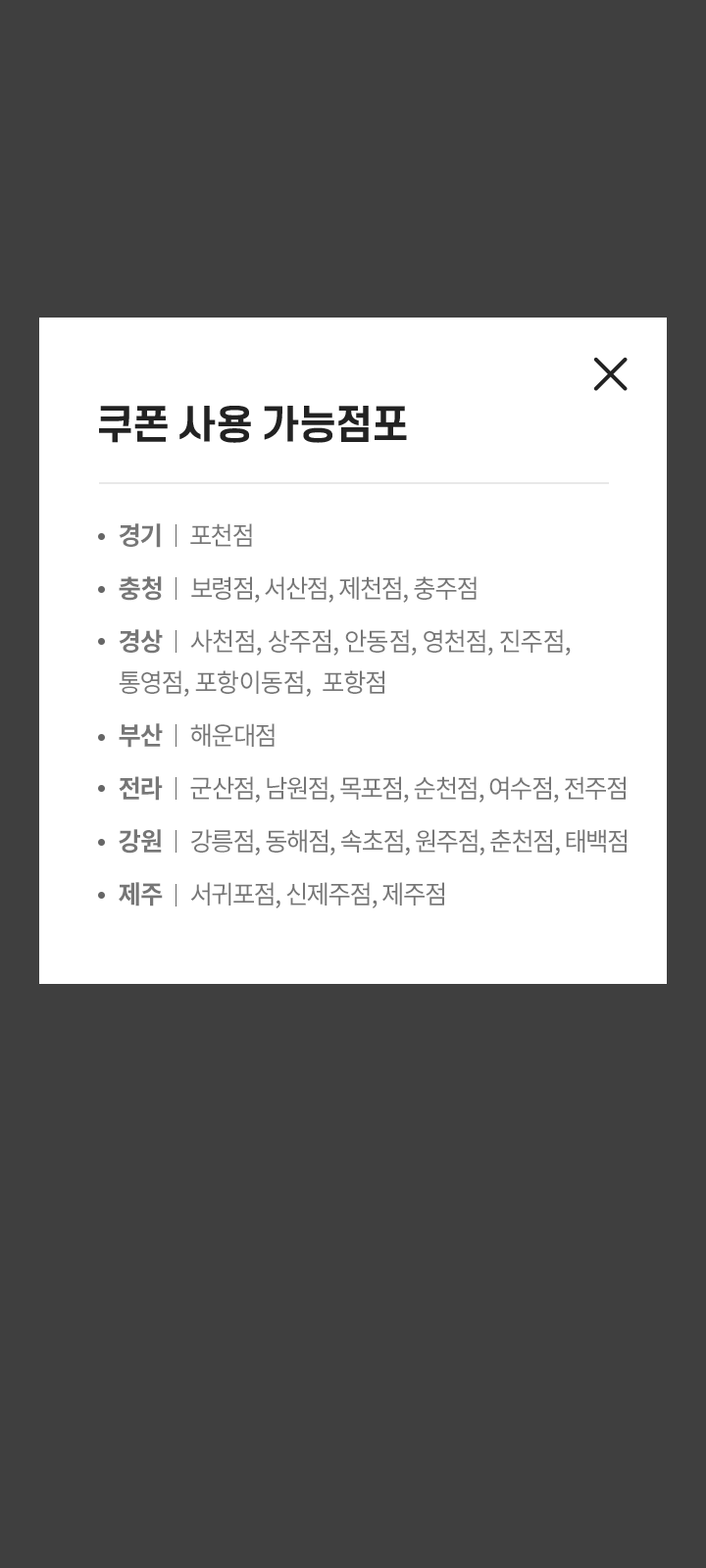 - 사용가능 점포: 전국 휴자기 점포 29개 참여 (경기 포천점, 보령점, 서산점, 충주점, 사천점, 상주점, 안동점, 영천점, 진주점, 토영점, 포항이동점, 포항점, 부산 해운대점, 전라 군산점, 남원점, 목포점, 순천점, 여수점, 전주점, 강릉점, 동해점, 속초점, 원주점, 춘천점, 태백점, 서귀포점, 신제주점, 제주점)