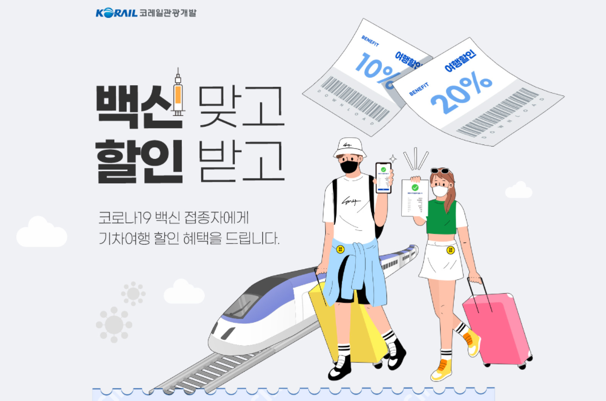 코레일 관광개발에서 진행하는 백신접종 독려 이벤트다. 이에 참여하는 상품은 관광형 · 휴양형으로 전국 전통시장 팔도장터관광열차 기차여행, 산림관광자원과 연계한 기찻길 옆 숲 여행 등 20여 가지 이상의 상품이 참여한다. 백신접종 할인이벤트는 1인당 1회만 가능하며, 동반 1인까지 할인 적용이 가능하다.