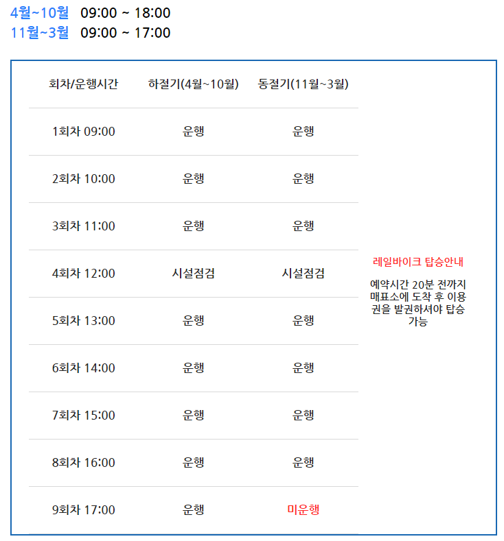 - 레일 바이크 요금: 개인 2인 15,000원 / 3인 19,000원 / 4인 23,000원