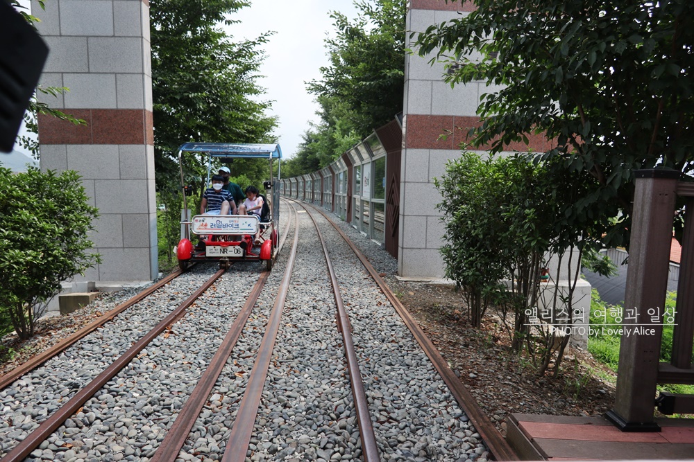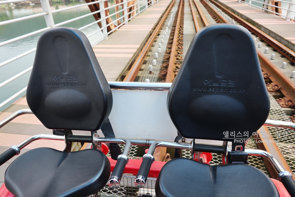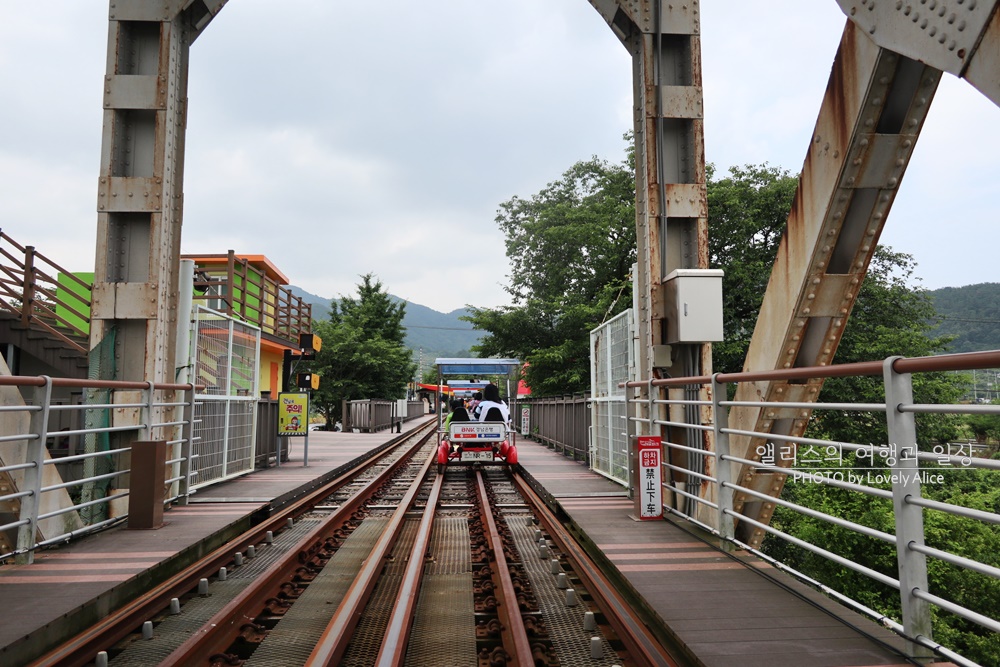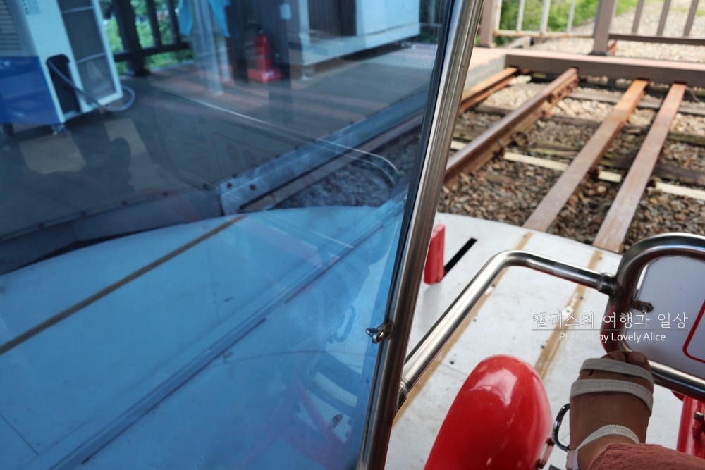 레일 바이크는 레일 위에서 탑승하는 4인 공용 자전거다. 물론 이 레일 바이크를 운행하는 사람은 앞에 탑승하는 2인이다. 사진에서 보이다시피 일반 자전거처럼 페달을 밟아서 앞으로 전진한다. 그러므로 사실 꽤 어려운 것은 아닌데, 하다보면 은근 운동이 되는 편이라 너무 뜨거운 여름에는 탑승을 추천하지 않는다. 1명이 페달을 밟아도 진행되지만 아무래도 2인분까지 해야한다는 단점도 작용한다. 뒷좌석에 앉으면 페달을 밟을 필요는 없다. 그냥 앉아서 구경만 하면 된다.