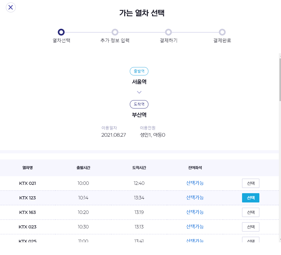 2. 원하는 기차 출발시간을 선택한다.