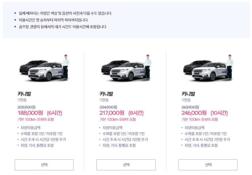 11인승 카니발이 대기하고 있고 기본 6시간 188,000원부터 이용할 수 있다. 혼자 이용한다면 부담될 수 있지만 카니발 11인승이므로 인원수가 많은 이가 탑승할 계획이라면 5명만 탑승해도 하루종일 1인당 37,600원으로 부담이 훅 줄어든다.