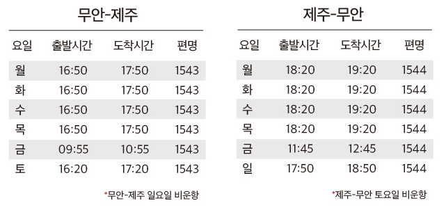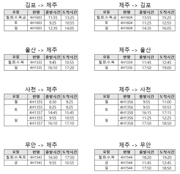 - 노선: ① 김포 - 무안,울산,사천,제주 ② 제주 - 무안,울산,사천,김포