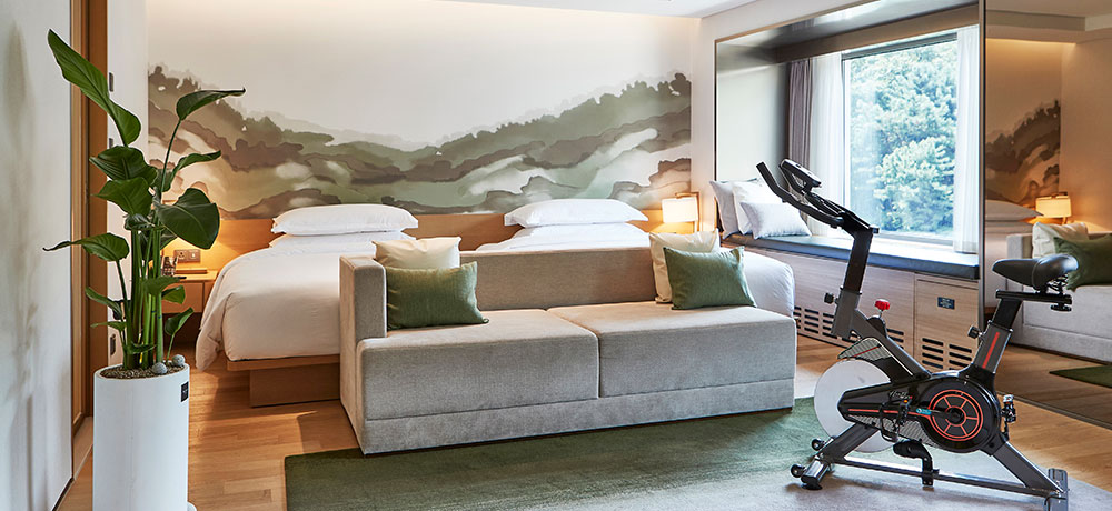 전통 한지 가죽으로 제작된 가구, 자연을 느낄 수 있는 그린월, 비건 충전재가 사용된 인테리어 소품등 비건 전용 객실 내부는 대부분 비건 소재로 채워져있다. 여기에 객실내 플라스틱 사용을 최소화한 친환경 어매니티, 친환경 1등급 린넨을 이용한 베딩, 공정무역 면화를 사용한 타월을 제공하여 호텔에서 보내는 시간에 대한 부담감을 한층 줄일 수 있다. 그와 더불어 비건 음료와 스낵이 준비되어 있고 100% 비건 인증받은 와인까지 무료로 제공된다. 이와 더불어 비건조식 세가지중 하나를 선택할 수 있어서 비건으로서의 삶의 선택을 폭넓게 할 수 있도록 준비했다. 재미있는 것은 핸드폰 같은 작은 디바이스를 충전시킬 때는 힐스윙으로 건강도 지키고 에너지도 절약할 수 있는 재미난 기회도 준비되어있다.