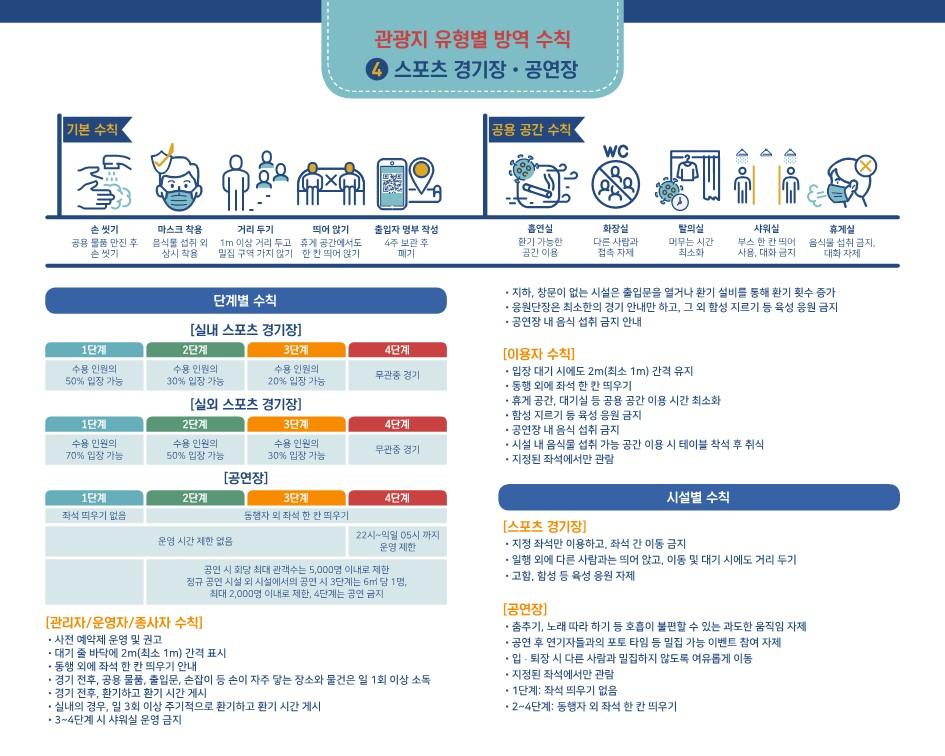 거리두기 단계별 지침에 따라 각 시설에 대한 방역 기준과 규제가 달라진다. 사실 매번 단계가 달라지고 바뀜에 따라 일일이 확인해야하지만 그게 쉽지는 않은데, 한국관광공사에서는 이런 부분을 조금 더 쉽게 확인할 수 있도록 "관광분야 시설별/단게별 방역수칙"안내 가이드를 제공하고 있다.