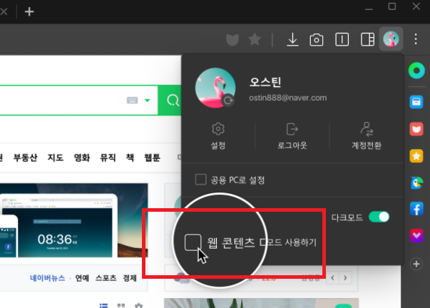 2. 자동으로 다크모드 변경되지만, 테두리가 아닌 전체 화면 다크모드로 변경하고 싶을 경우 한 번 더 버튼을 눌러주어야 한다. 다시 사람모양 아이콘(웨일 브라우저 로그인)을 클릭 후 "웹 콘텐츠 다크모드 사용하기" 클릭