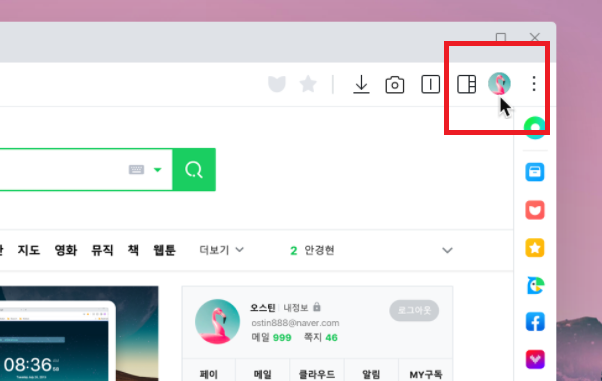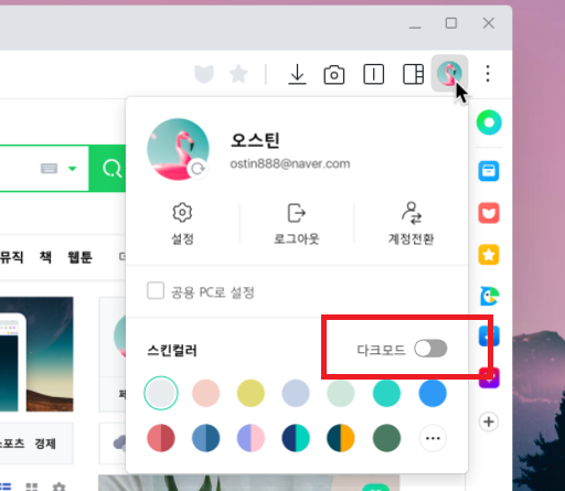 1. 화면 우측 상당의 사람모양 아이콘(웨일 브라우저 로그인)을 클릭 - 다크모드 버튼 누르기