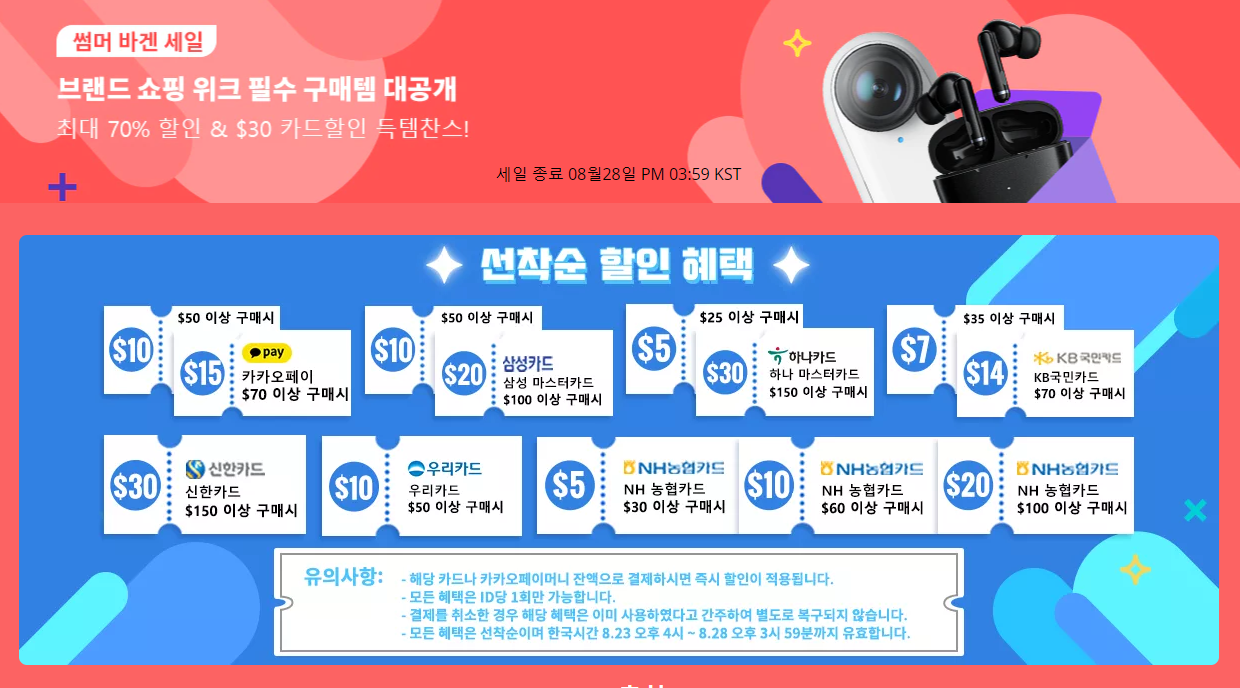 · $100 USD 이상 결제 시 $10 USD 할인(Promo Code: KR828) (선착순 5,000건)