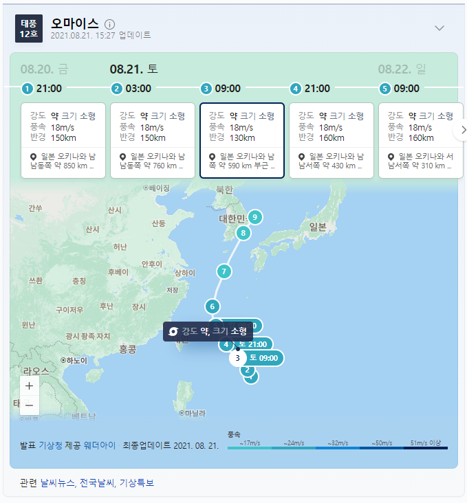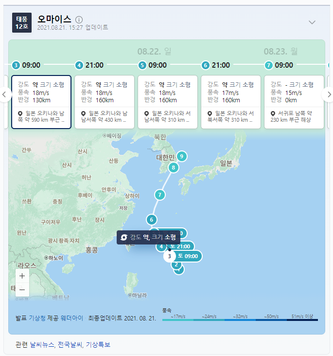 21:00 강도: 약크기 소형 / 풍속 17m/s / 반경 160km / 일본 오키나와 서북서쪽 약 310 km 부근