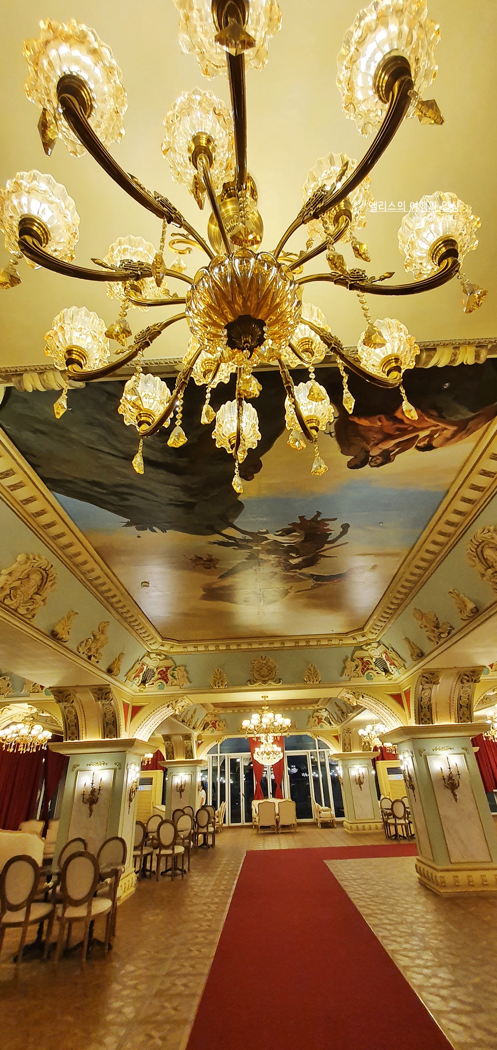 빨간색 카페트가 길이 이어진 곳에 모두 깔려있었다. 여기에 화려한 샹들리에 조명까지 더해지고 곳곳에 밝은 조명이 더해졌다. 천장 역시 심심하지 않았다. 화려한 그림이 천장 곳곳을 감싸고 있었고, 그에 더해 각종 조각품들과 디자인들이 벽 곳곳에 있었다. 이렇게 사진만봐도 화려함이 물씬 느껴지는데 실제 저 공간에 있어보니 모든 화려함이 나를 싸~악 감싸는 아주 기분 좋은 느낌이었다.