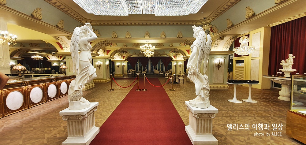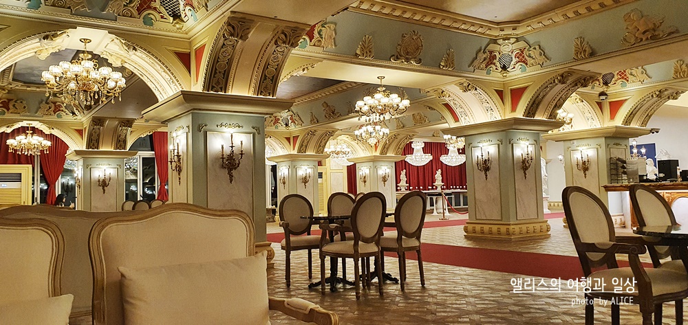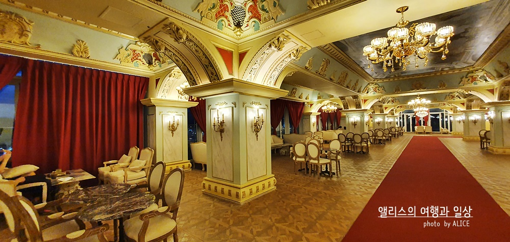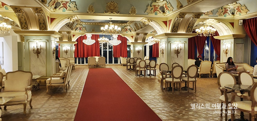 이렇게 화려한 궁전 스타일의 페리데스 하이엔드 카페를 볼 수 있다. 이 화려함은 카페에서 만나는 것은 세상 처음이라 슬쩍 적응이 안되었달까. 뭐 그 덕분에 요즘 시기에 따닥따닥 사람들과 붙어있지 않고 여유로운 공간에서 카페의 메뉴를 즐길 수 있다는 점은 상당한 장점이었다.