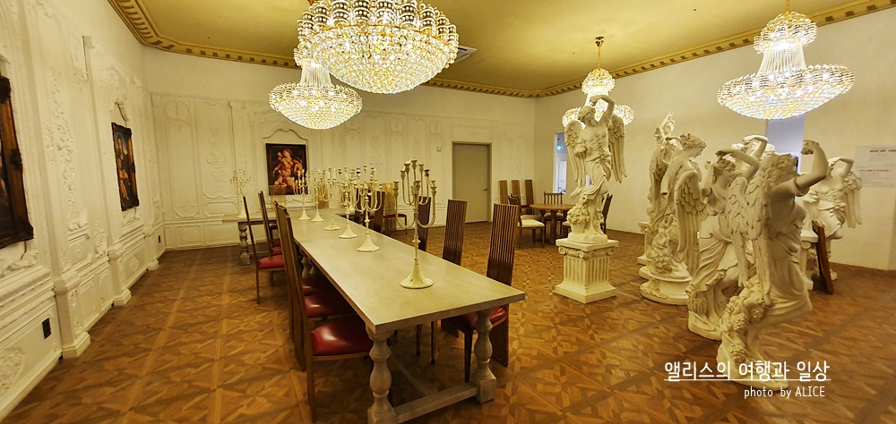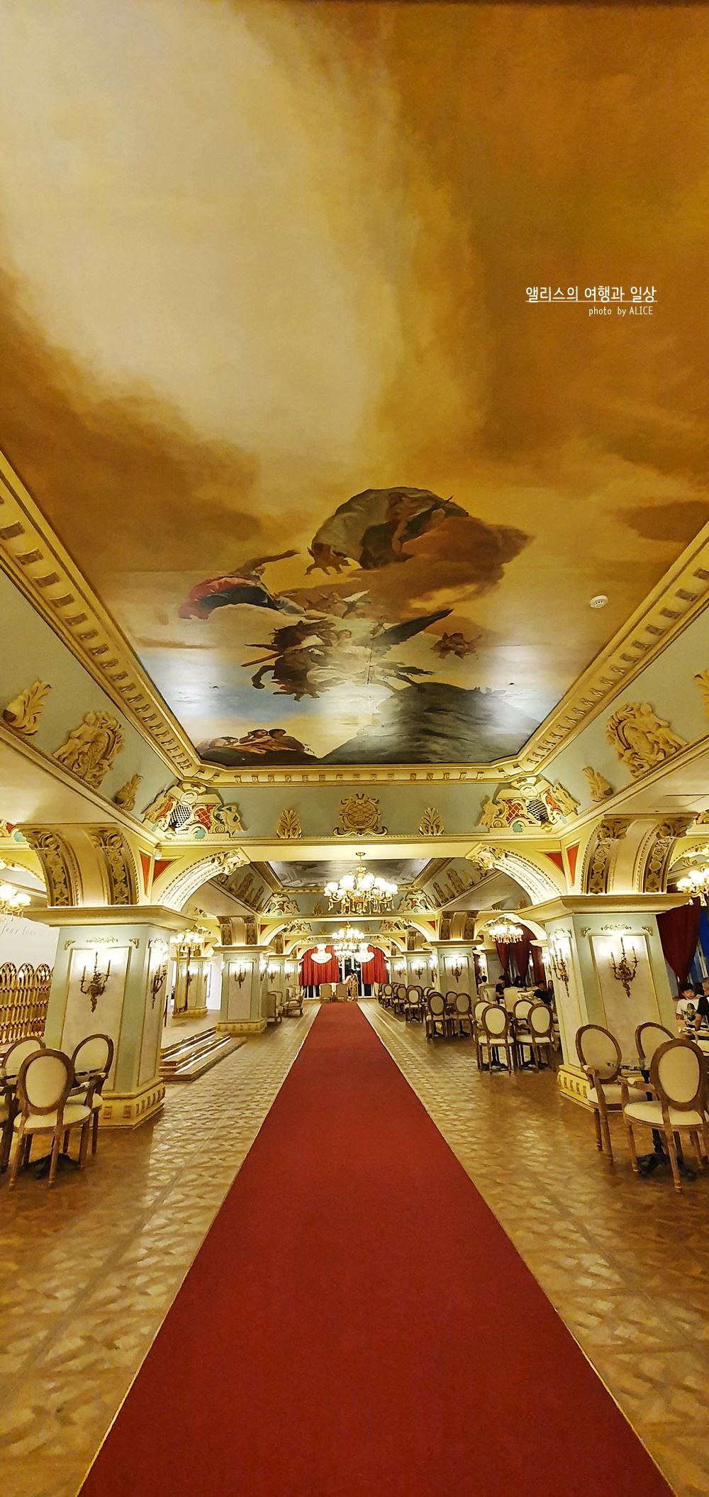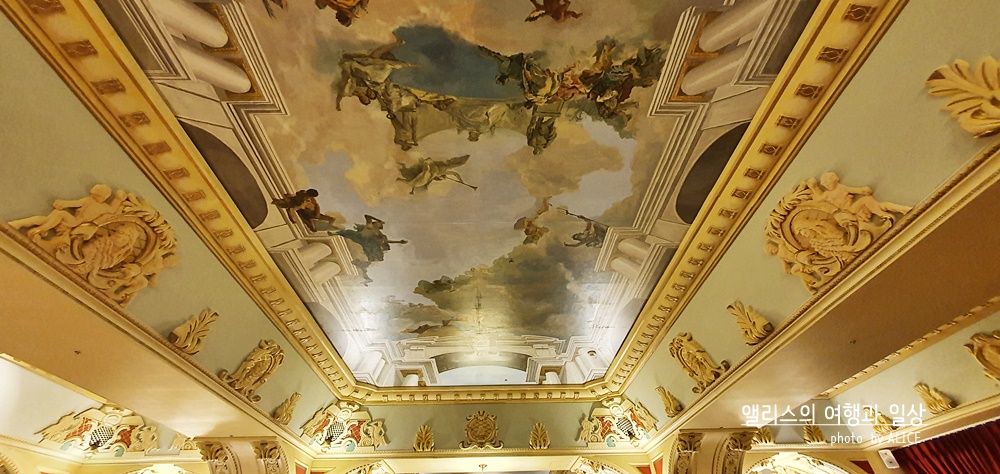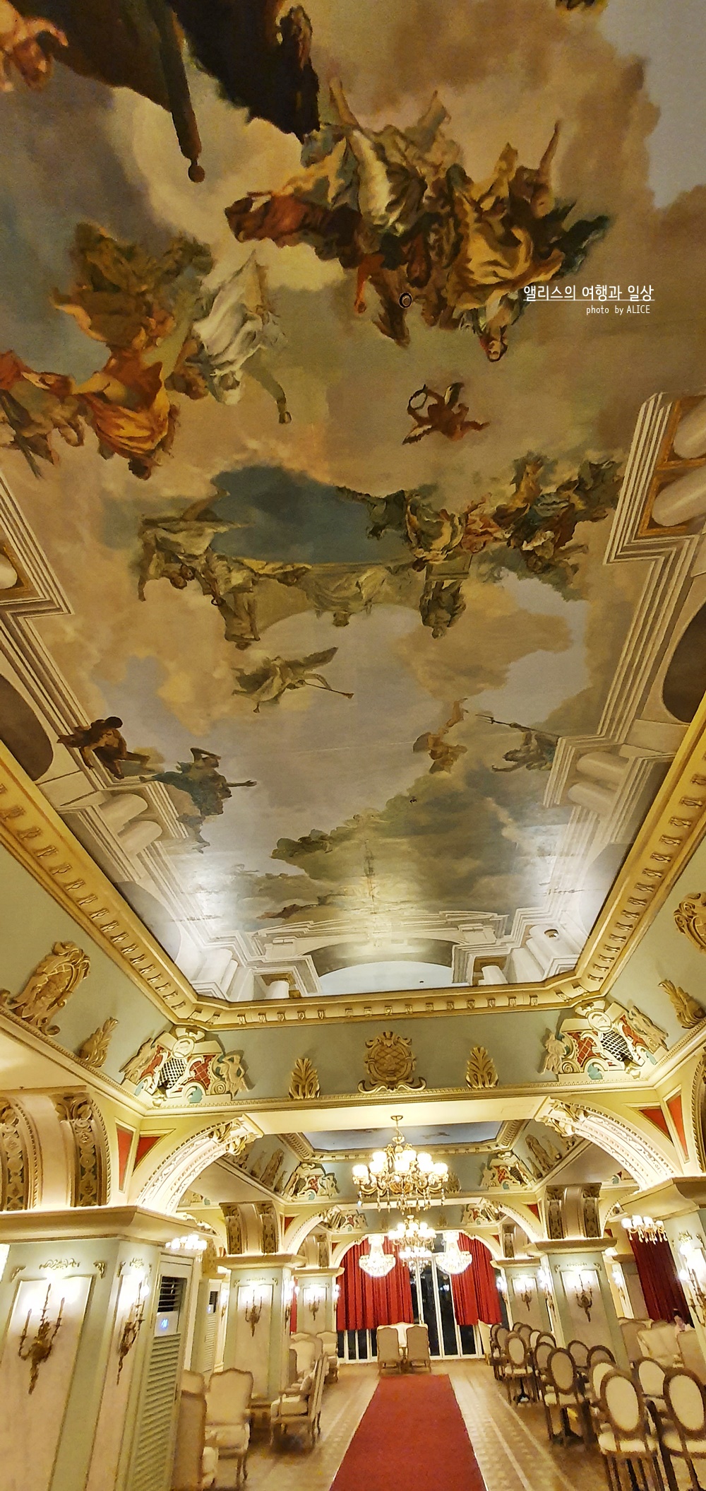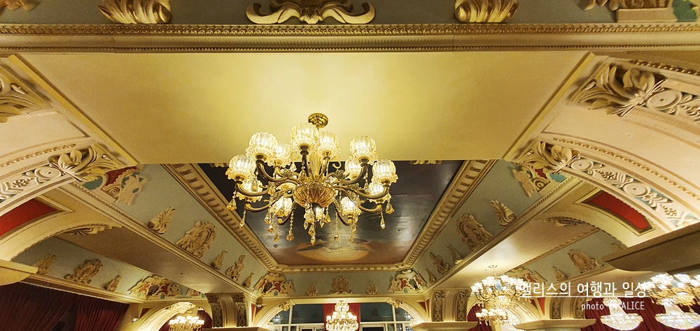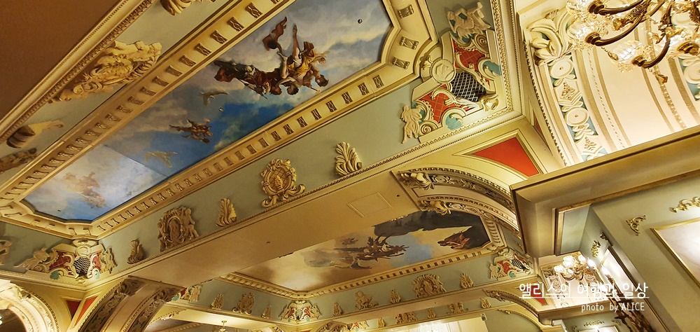 빨간색 카페트가 길이 이어진 곳에 모두 깔려있었다. 여기에 화려한 샹들리에 조명까지 더해지고 곳곳에 밝은 조명이 더해졌다. 천장 역시 심심하지 않았다. 화려한 그림이 천장 곳곳을 감싸고 있었고, 그에 더해 각종 조각품들과 디자인들이 벽 곳곳에 있었다. 이렇게 사진만봐도 화려함이 물씬 느껴지는데 실제 저 공간에 있어보니 모든 화려함이 나를 싸~악 감싸는 아주 기분 좋은 느낌이었다.