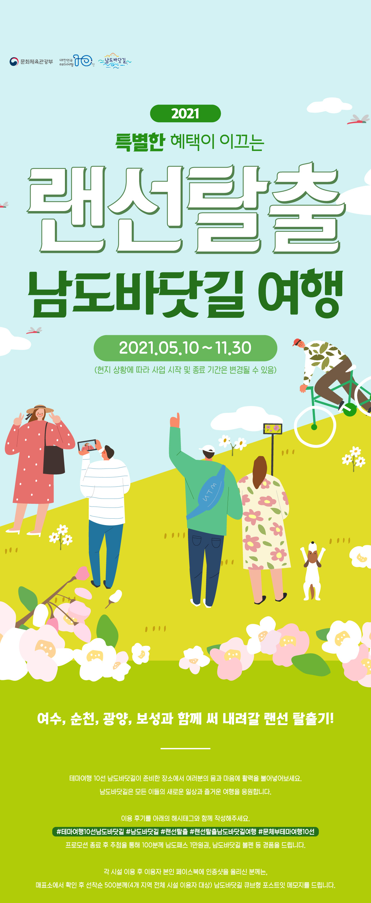 ① 경품이벤트: 이용후기와 함께 해시태그(#테마여행10선남도바닷길 #남도바닷길 #랜선탈출 #랜선탈출남도바닷길여행 #문체부테마여행10선)을 암기면 추첨을 통해서 100명에게는 남도패스 1만원권, 남도바닷길 볼펜 등 경품 증정
