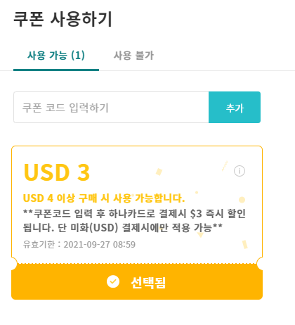 - 할인조건: 결제시 달러 + 하나카드 결제시 3달러(약 3,500원)가 할인된다.