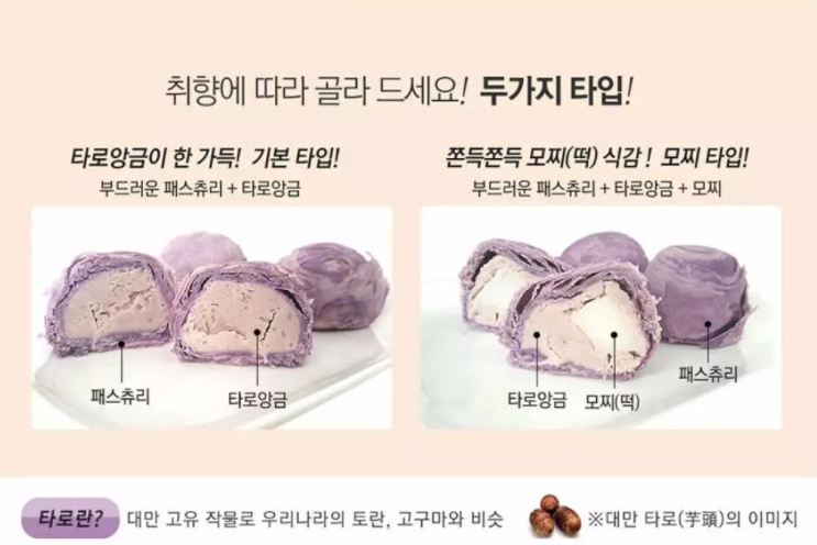 · 한국에서는 펑리수보다도 더 구하기 힘든 타로케이크! 겹겹이 쌓인 패스츄리 안에 타로앙금이 가득! 과하지 않은 단맛의 대만 고급간식 타로케이크는 어른들의 간식으로도 좋으며 차, 우유, 커피 어느 것과 함께해도 맛이 배가 된다. 담백한 오리지널과 쫀득한 모찌 두가지 맛을 선택할 수 있다.