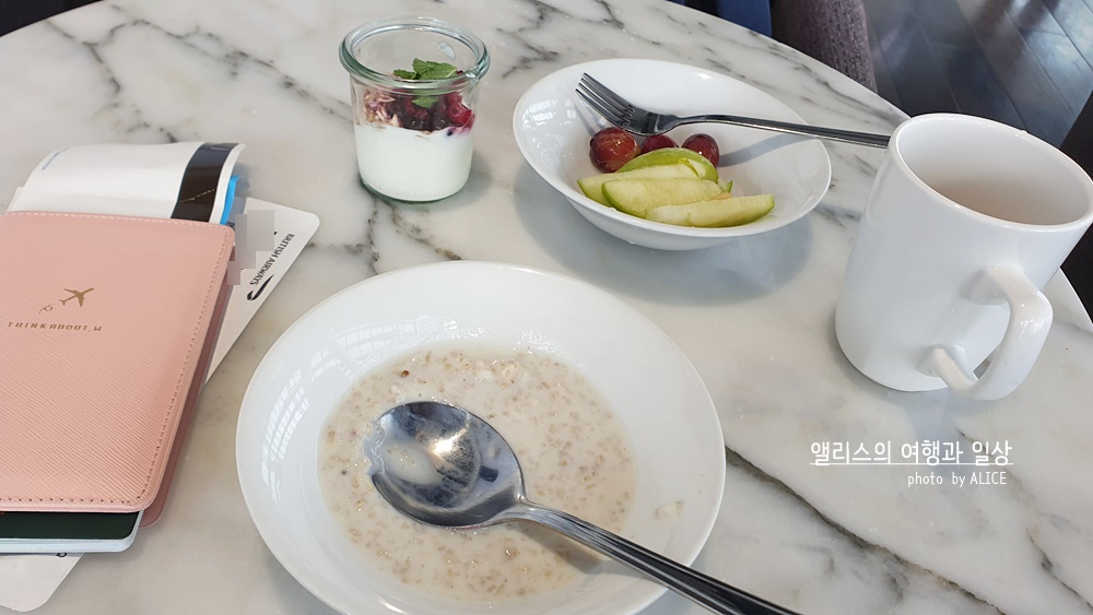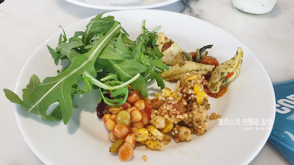 콜드밀에는 평균적으로 6~7가지 정도가 준비되어있는데 앞서 말한대로 내가 찍은 사진이 안보이므로..... 대충 이걸로 대체하자면... 간단한 그린샐러드가 가능하긴 하나 종류가 다양하진 않다. 주로 그린샐러드 2~3가지 종류와 파스타가 준비되어있다. 이날 제공된 죽 중 하나가 우유가 섞인 오트밀. 미끄덩한 맛이 조금 특이했으나 고소한 맛은 좋았다. 파스타도 딱히 내 입에 안 맞고 같이 곁들어진 콩과 옥수수 저 요리도 나에게 별로고.. 아무튼 이 라운지에서는 유독 내 입에 맞지 않은 음식이 내가 방문한 시각에 제공되고 있었다. 뭔가 나랑 잘 안맞는 듯!