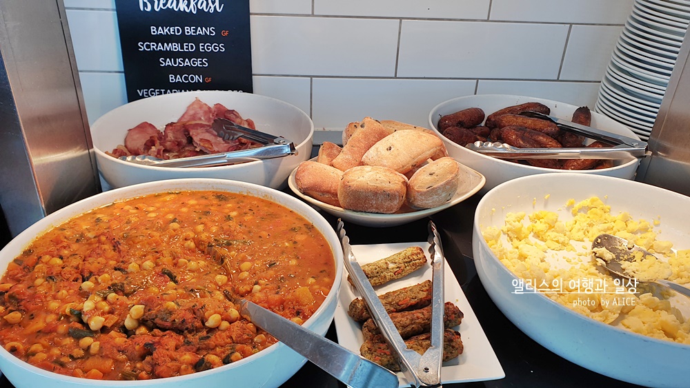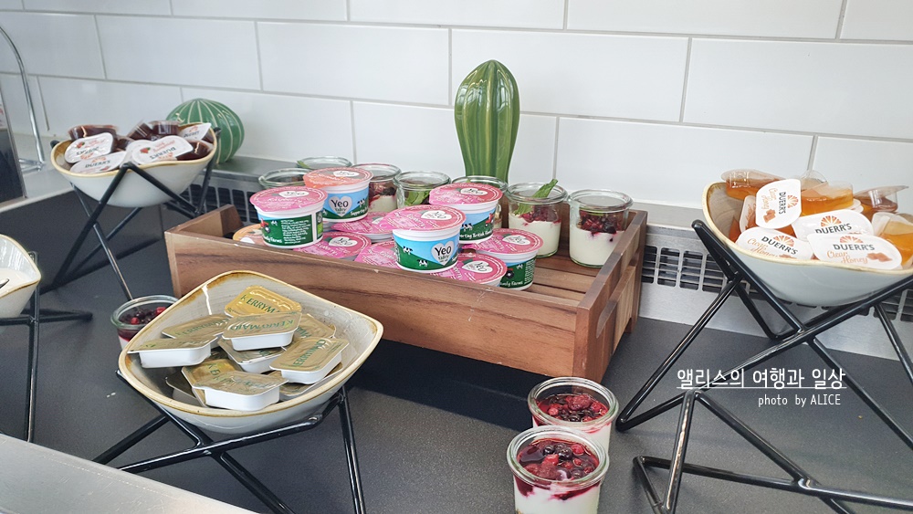 요거트응 두 종류에 과일도 듬뿍 따로 제공(사진을 찍지 못했음)되었다. 잼종류는 얼추 세가지에 맛있는 버터 한가지. 마실 수 있는 차(茶)는 얼추 10가지 정도 되는 것 같았다. 영국이라 그런가 차(茶)종류가 다양해서 좋았다.