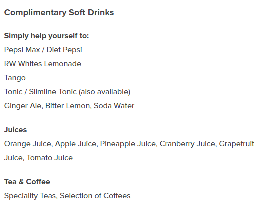 무료로 제공되는 음식과 음료는 다양한 편이었다. 다만 음식은 위에 언급된대로 오전, 오후를 나누어서 제공되기 때문에 방문시각에 따라 메뉴의 차이는 있을 수 있다.