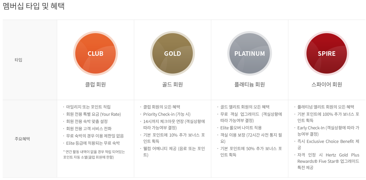② 플래티늄: 무료 객실 업그레이드 (객실상황에 따라 가능여부 결정), Elite 롤오버 나이트 적용, 객실 이용 보장 (72시간 사전 통지 필요), 기본 포인트에 50% 추가 보너스 포인트 획득