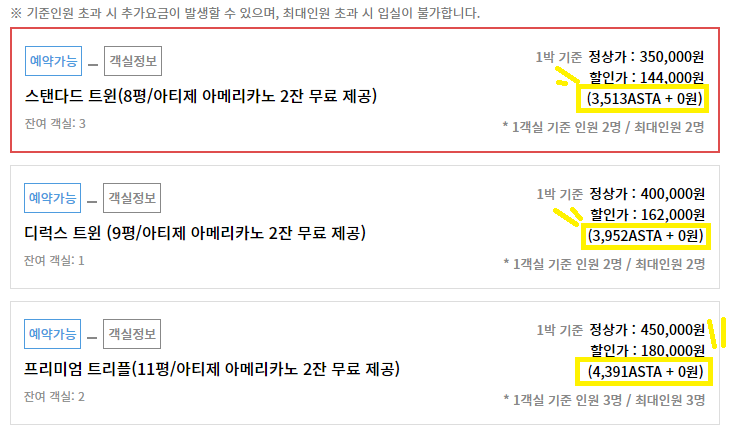스탠다드 트윈을 예약한다고 할 때, 카드 또는 일반 현금으로 결제시 144,000원으로 결제된다. 하지만 그 아래에 적힌 "3,513 ASTA"의 문구 그대로 아스타 코인은 코인 거래소에서 구매한 뒤 아스타 월렛에 옮긴 후 결제하면 그 가격 호텔 예약이 완료된다. 현재 3,513 아스타 코인의 가격은 104,015원(거래수수료 포함)이다. 즉 아스타 코인으로 결제하면 약 10만원대에 호텔 예약이 완료된다. 트윈룸의 경우 평일 비수기라면 가장 최저가는 아고다 기준 12만원 정도다. 확실히 코인 결제시 2만원 정도 할인된다고 보면 된다.