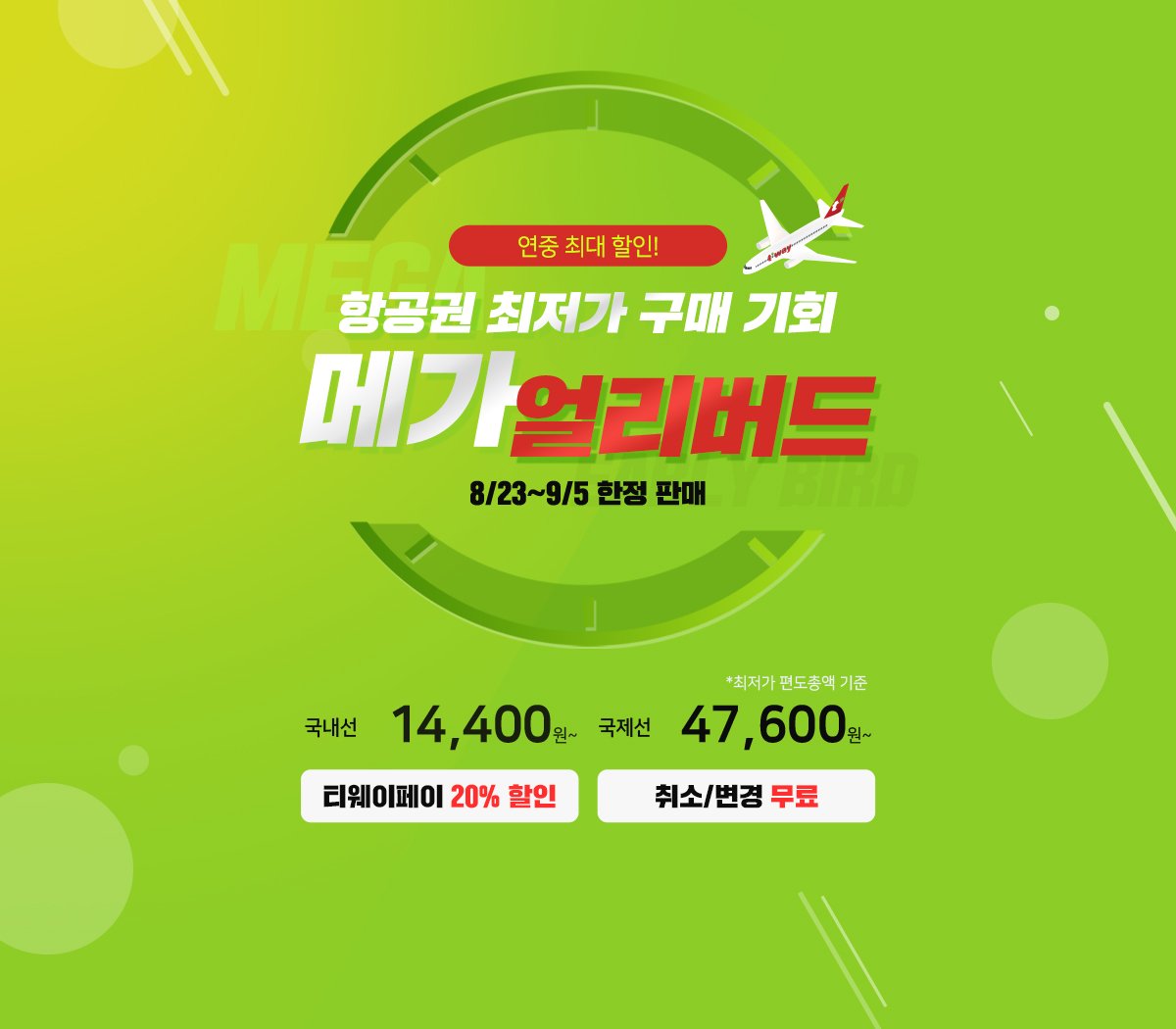 14일간 진행하는 티웨이 메라 얼리버드 이벤트. 1회 한해 수수료 없이 무료 변경 취소 가능하며 매일 오전 10시에 오픈되고 있다. 이 메가 얼리버드는 올하반기부터 내년 봄까지 이용할 수 있는 가장 저렴한 티웨이 항공권이며 추가로 다양한 할인혜택을 더할 수 있어서 최저가로 항공권 구매가 가능하다.