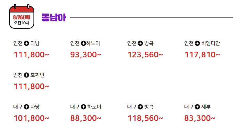 인천 - 방콕 123,560원부터 / 인천 - 비엔티안 117,810원부터 / 인천 - 호치민 111,800원부터