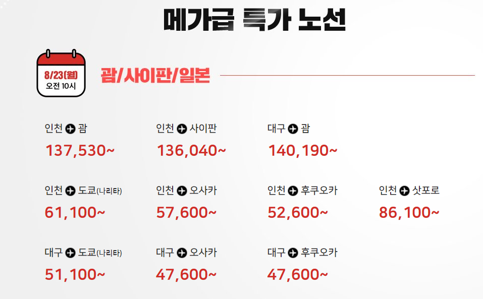 대구 - 도쿄 나리타 51,100원부터 / 대구 - 오사카 47,600원부터 / 대구 - 후쿠오카 47,600원부터