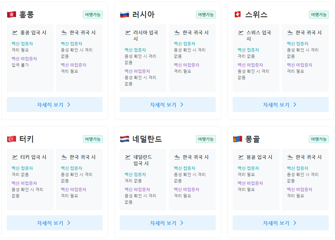 백신접종여부에 따라 자가격리 면제 또는 입국조건이 조금씩 달라지므로 입국 원하는 국가가 있을 경우 "자세히 보기"를 클릭하면 알 수 있다.
