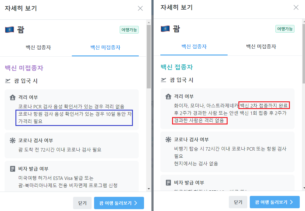 예를 들어 괌의 경우 백신접종자와 미접종자에 따라서 설명이 다르다. 격리여부도 달라진다. 그러므로 이 경우 반드시 확인해서 필요한 서류를 준비하는 것이 좋다.