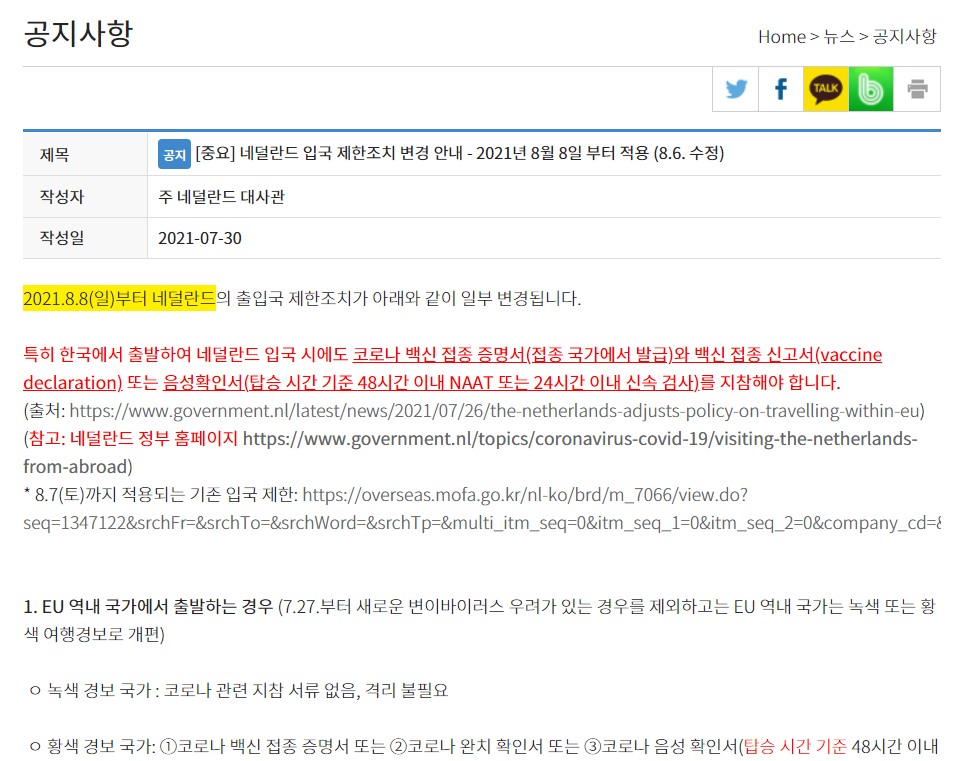 2021년 8월 8일부터 대한민국 국민이 네덜란드 입국시