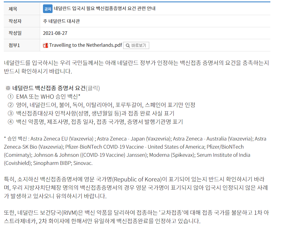 특히 한국에서 출발하여 네덜란드 입국 시에도 코로나 백신 접종 증명서(접종 국가에서 발급)와 백신 접종 신고서(vaccine declaration) 또는 음성확인서(탑승 시간 기준 48시간 이내 NAAT 또는 24시간 이내 신속 검사)를 지참해야 한다.