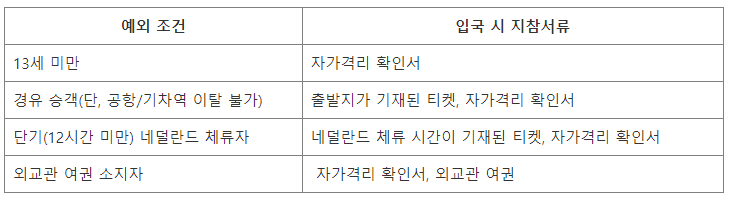 * 단, 네덜란드를 경유하여 제 3국으로 이동시 음성확인서 제출 불필요 → 경유조건 자세히 보기