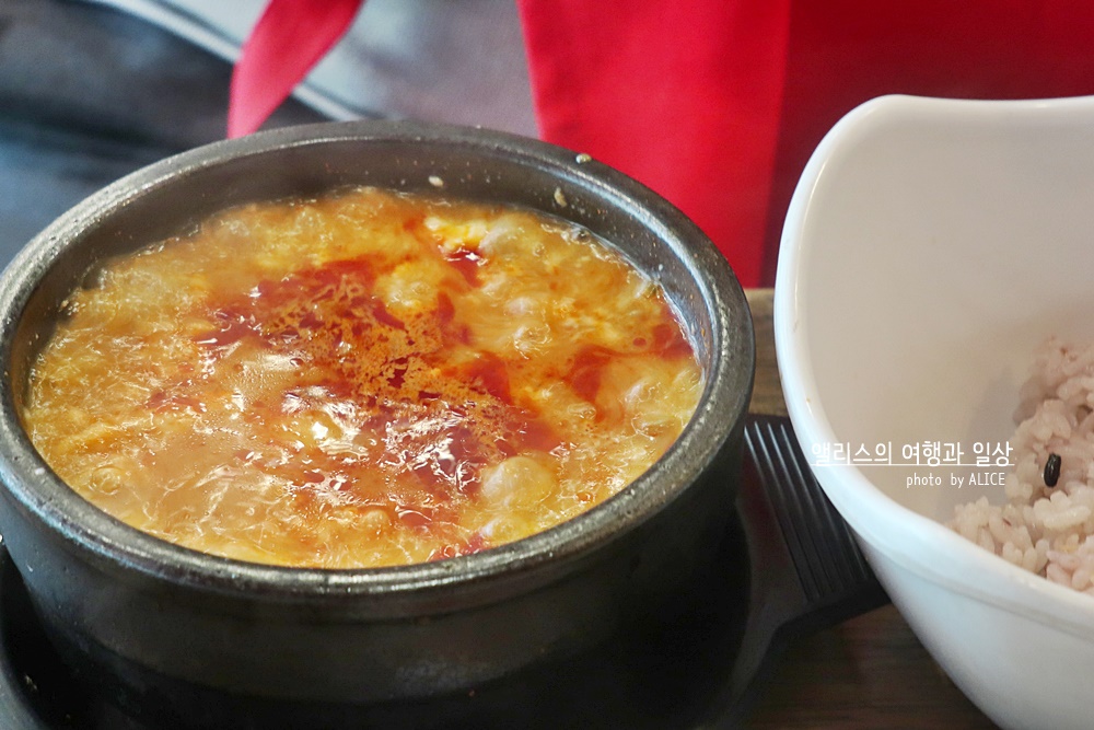 보글보글 올라오는 해물순두부찌개에 날계란 넣어서 잘 풀면 금새 익는다. 적당히 매콤한 맛이 감칠맛 도는 해산물로 만든 순두부찌개라 오리지널 순두부를 좋아하는 이들에게 안성맞춤.