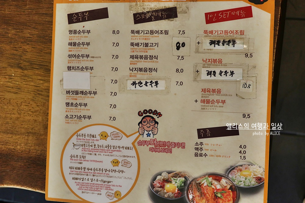 센텀시티의 물가는 다른 곳에 비하면 높은 편에 속하는데, 그럼에도 불구하고 반찬 넉넉하고 공기밥 무제한 리필에 든든한 순두부찌개 최저가가 7천원! 이건 말도 안되는 거임.. 아무리 저렴하게 먹어도 센텀에서는 최소 8천원 이상인것을! 그게 최저가인 것을 이곳에서는 정말 퀄리티 좋은 순두부에 7천원이라는 사실! 여기저기 가격을 올린 수정의 흐적이 보이지만 그래도 순두부는 내가 직장 다닐 때 가격 그대로 유지하고 있다. 최고!