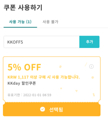 2. 결제 단계에서 쿠폰사용하기 버튼을 눌러 KKOFF5 할인코드 입력 후 할인쿠폰을 선택한다. 그리고 최종 할인된 가격으로 결제하기