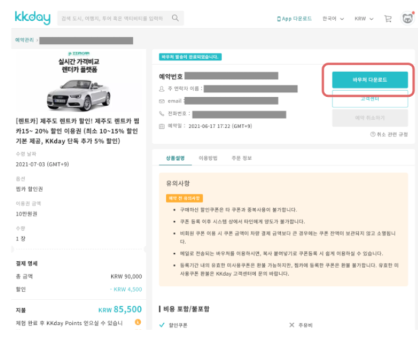 3. 결제가 완료되면 KKDAY 마이 페이지에서 결제한 상품의 바우처 다운로드를 클릭한다. 바우처를 보면 찜카 웹사이트에서 사용가능한 코드를 확인할 수 있다.