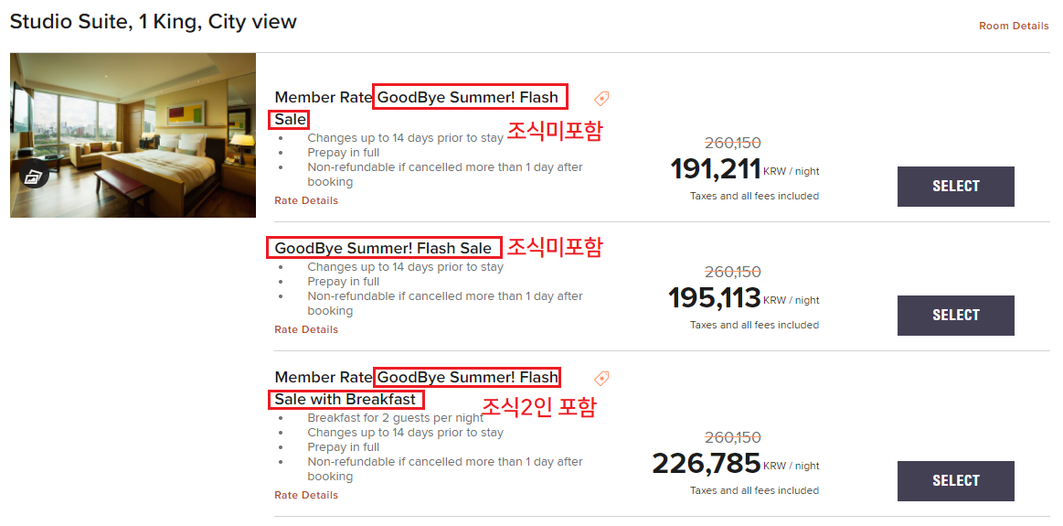 - 플래시 세일 투숙 기간: 투숙기간의 경우 내년까지 이 프로모션으로 객실 예약이 가능하지만, 시간이 지날수록 가격이 높아진다는 점 참고하자.