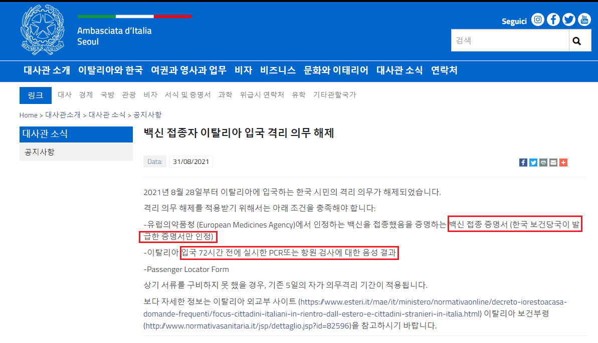 ▶ 주한 이탈리아 대사관 공지사항 바로가기