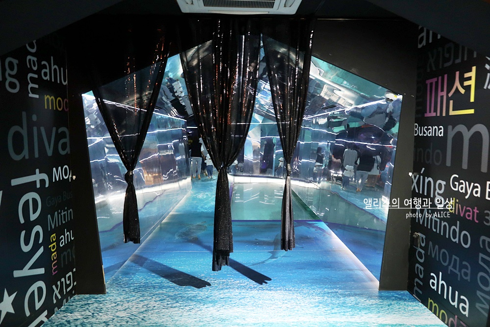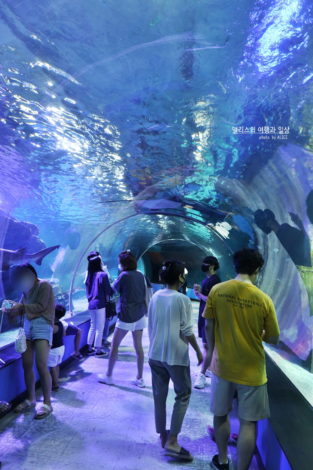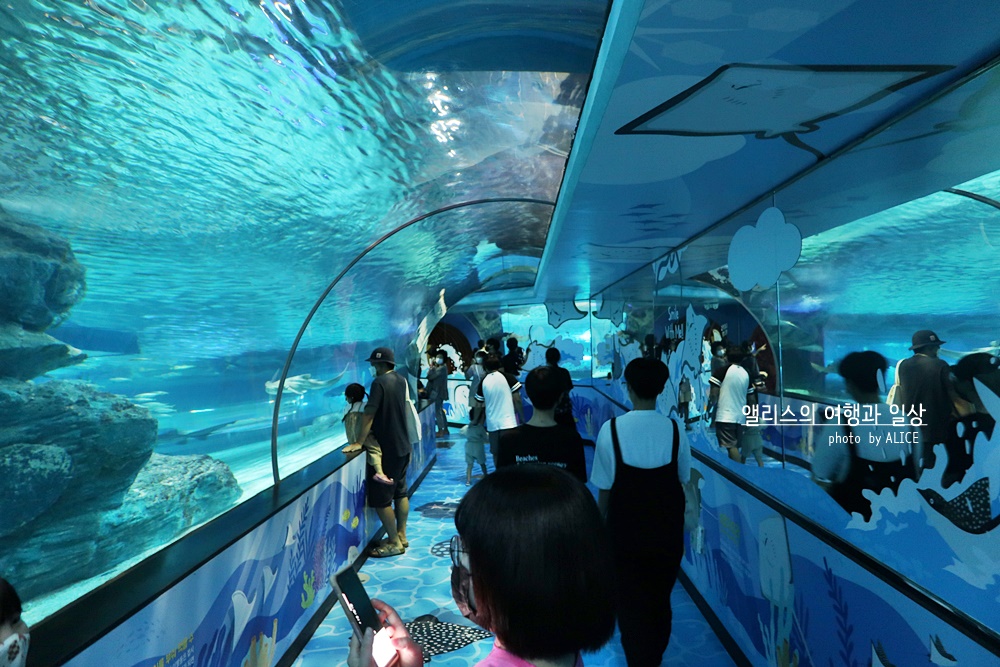 상어는 물론 다양한 해양생물을 한 번에 볼 수 있는 해저터널은 나를 둘러싼 모든 공간이 바다로 이뤄져있는 공간이다. 그래서 가장 인기가 많은 공간 중 하나로, 이곳에서는 정말 많은 사람들이 인증사진을 찍는다.