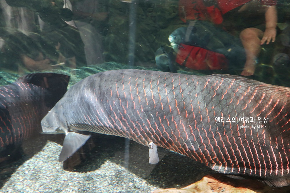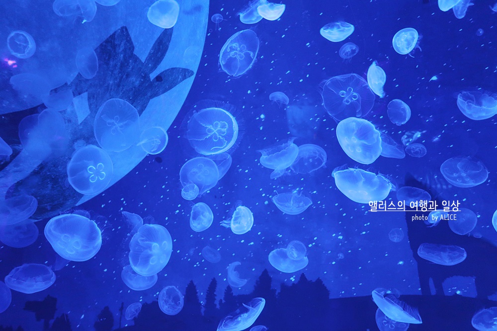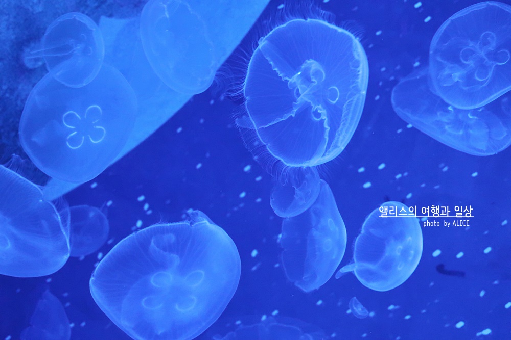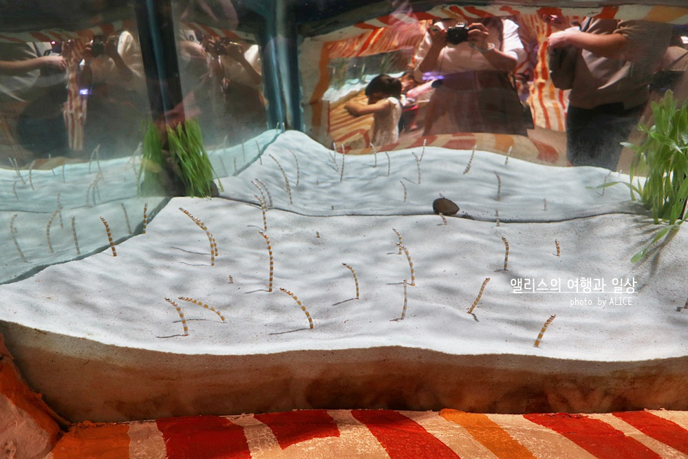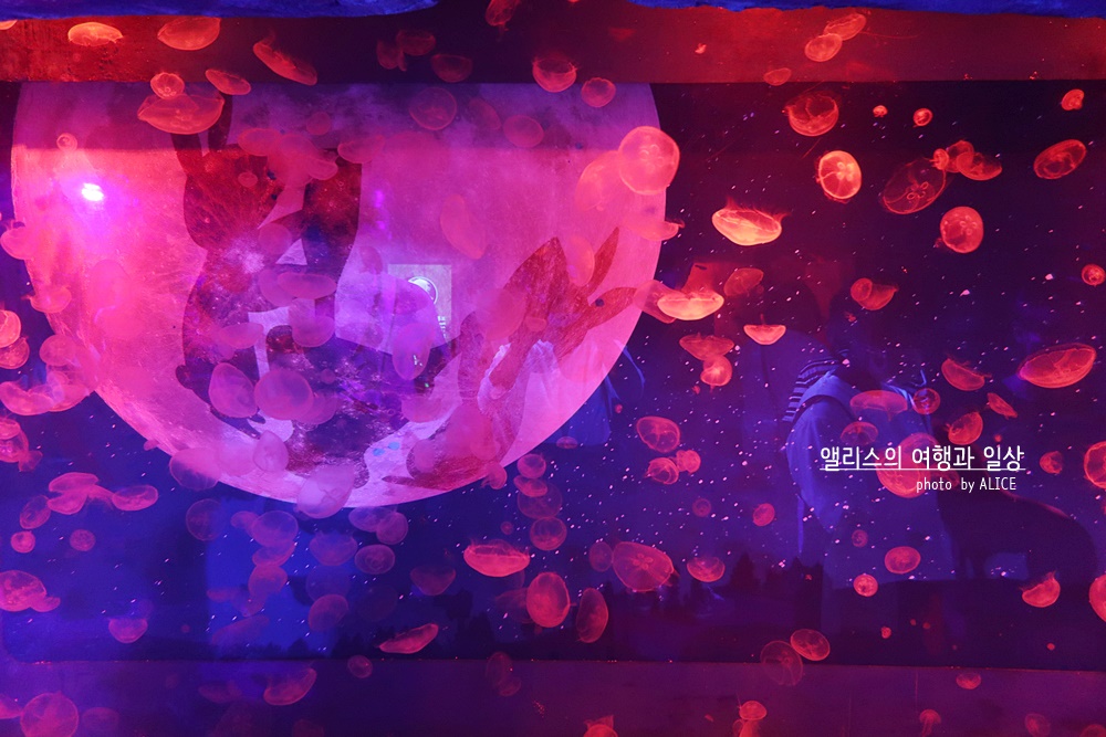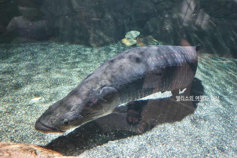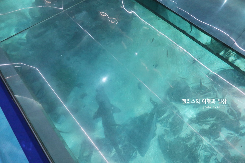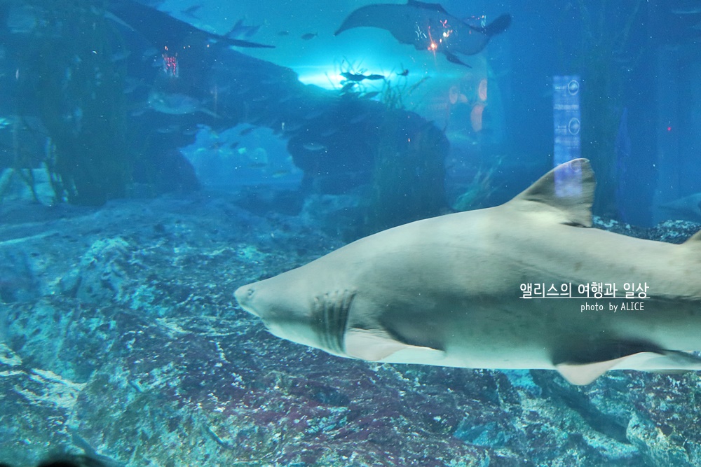 한국 영화 촬영장소로 많이 이용된, 대형 수족관 앞. 마치 환상적인 바다 속에 내가 들어가서 이들을 보는 기분이 든다. 모든 이들이 숨죽여서 이곳을 관람하는 곳이다. 그리고 아쿠아리움 곳곳에 앉아서 쉴만한 공간이 없는데, 이곳에서는 대형 스크린 화면처럼 수족관 화면 바로 앞에 누구나 앉아서 쉴 수 있는 공간이 있어서 이곳에서 잠시 쉬는 사람도 많다.
