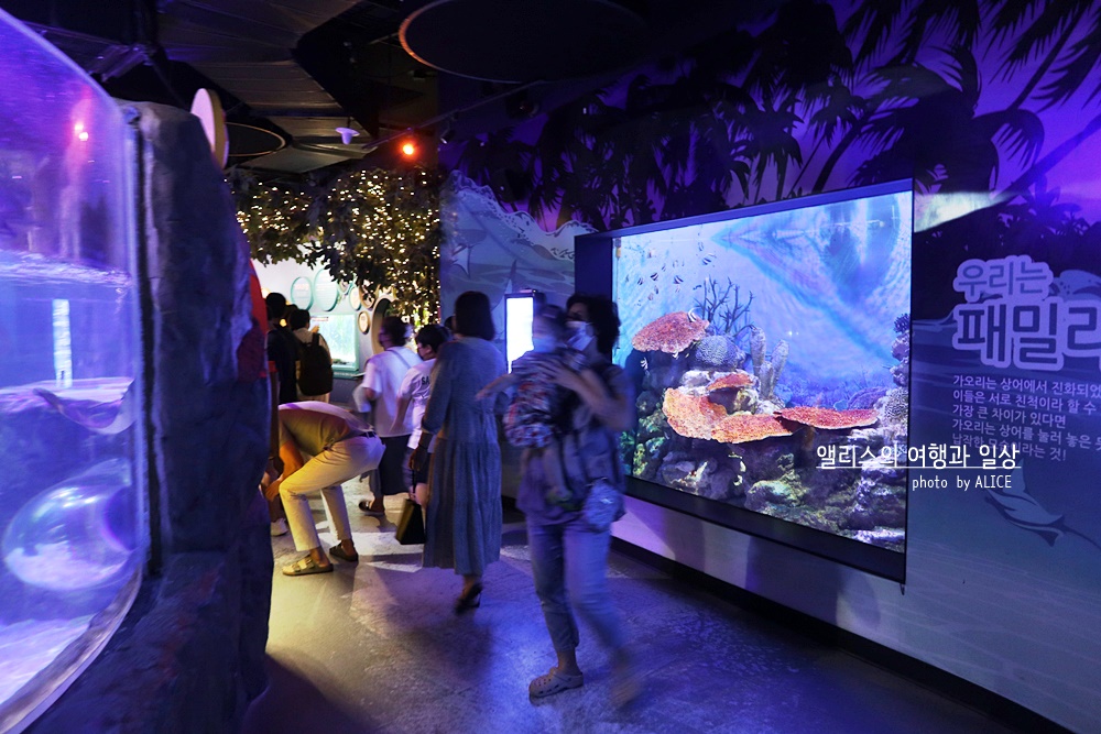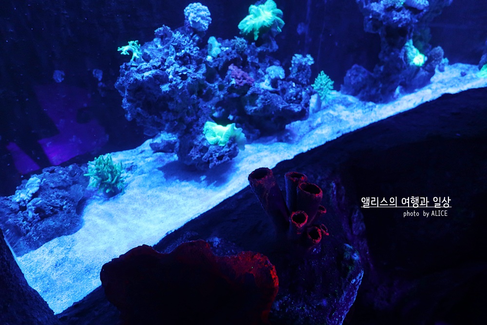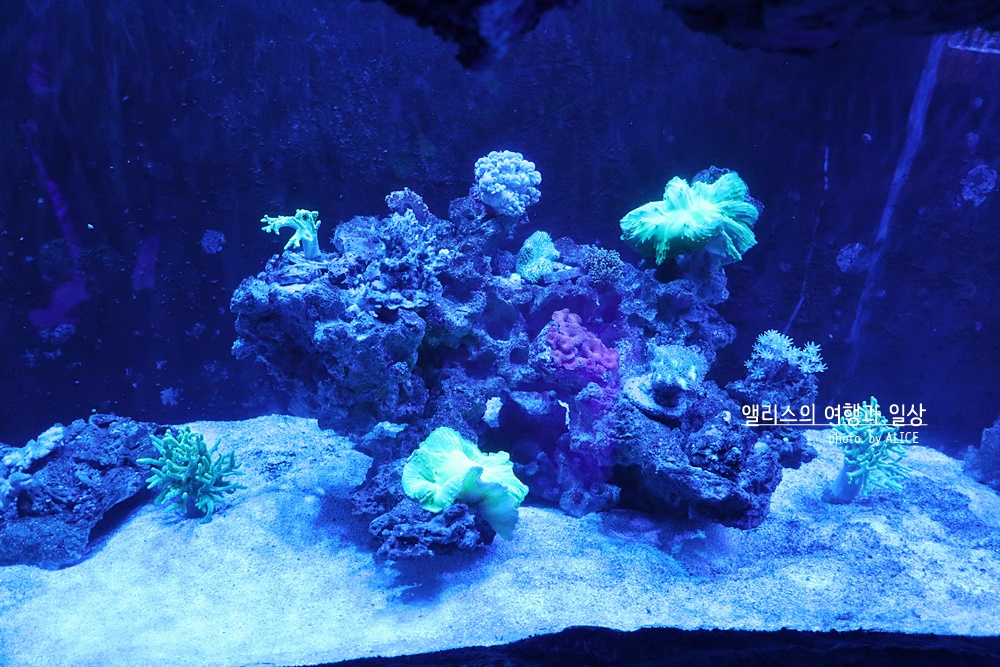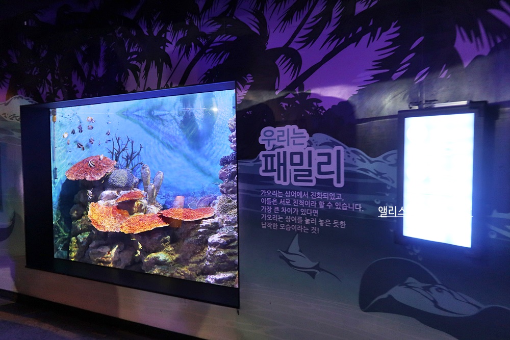 7m의 산호수조와 모든 해양생물이 하나의 작은 수중공간을 이루는 대형수조가 있는 곳.
