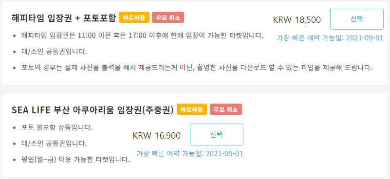 보다시피 주중입장권으로 구매하면 주중에만 방문가능하지만 대/소인 구분없이 16,900원이면 예약가능하다. 내가 볼 때 이게 부산 아쿠아리움 입장권 최저가다. 이 가격은 대/소인 구분없이 구매가능한데, 공식 가격의 소인가격보다도 더 저렴한 가격이다.